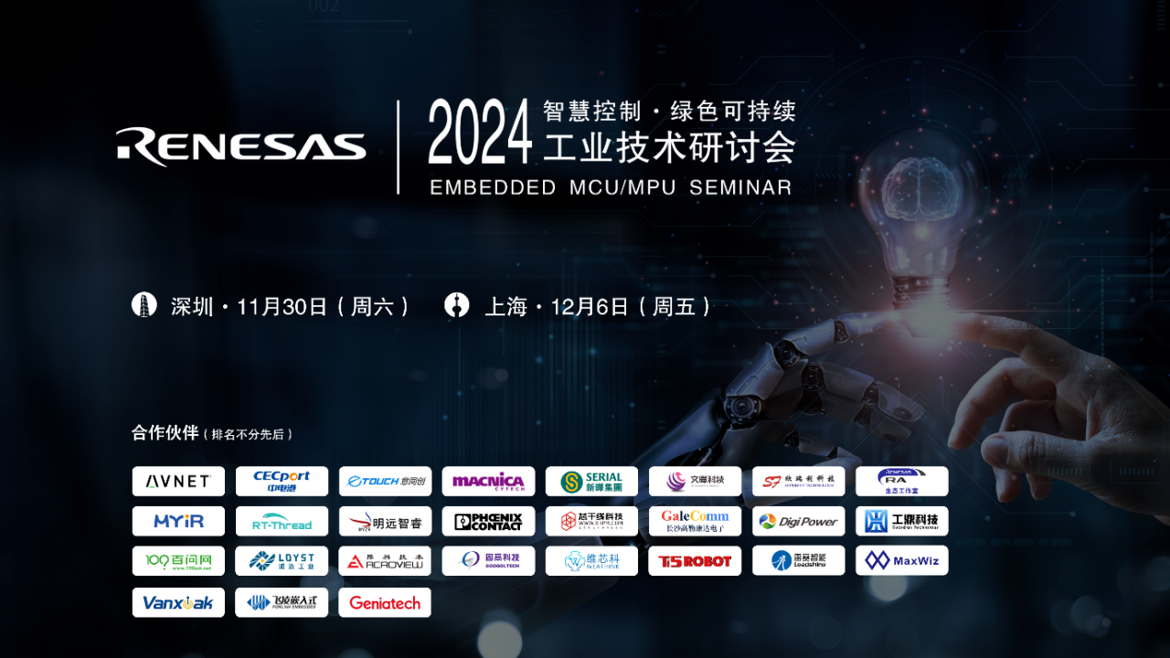以“智慧控制·绿色可持续”为主题,瑞萨电子将在深圳(11月30日)和上海(12月6日)举办2024 MCU/MPU工业技术研讨会,再次掀起全新工业产品、技术和方案的交流与碰撞。