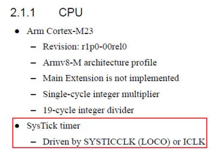 当 CLKSOURCE 位设置为“0”时,SysTick 定时器选择 SysTick 定时器时钟(SYSTICCLK)作为参考时钟;当 CLKSOURCE 位设置为“1”时,SysTick 定时器选择 CPU 时钟(ICLK)作为参考时钟。