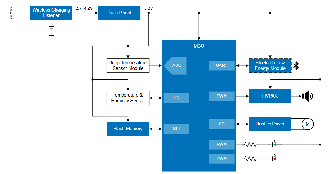 系统优势:超低功耗MCU可支持长时间佩戴,具有快速唤醒功能,还可减少充电频率