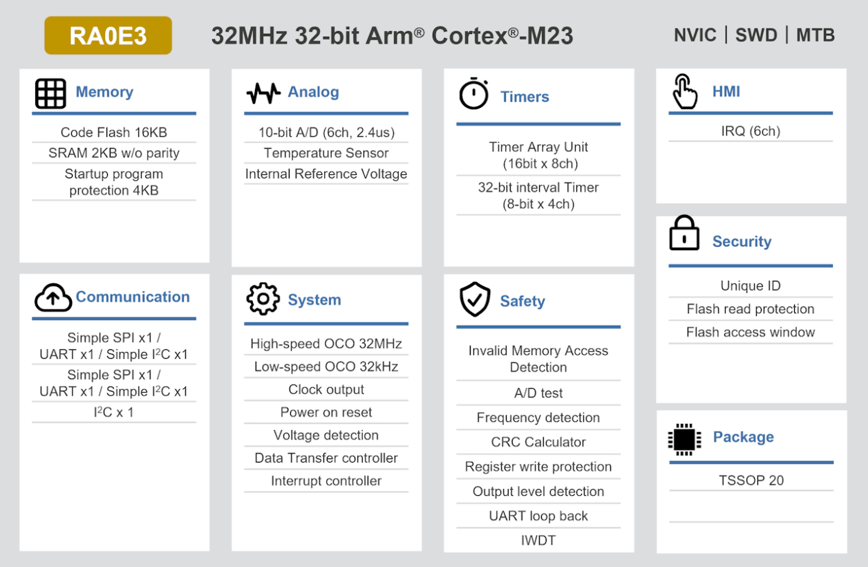 瑞萨RA0系列全新入门级RA0E3 MCU--20pin小型化、200nA超低待机电流、超低BOM成本MCU