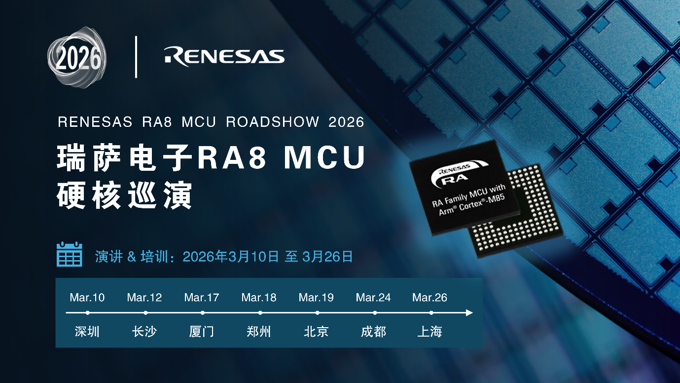 2026年3月,瑞萨电子RA8 MCU硬核巡演将依次在国内七座城市(深圳、长沙、厦门、郑州、北京、成都、上海)举办,重点介绍RA8架构、功能特性、工业自动化及边缘AI应用方案及本土生态成果,并同步开启两场动手实践(培训A:RA8T2核间通信及EtherCAT应用,培训B:RT-Thread RA8P1 AI应用开发),帮助嵌入式工程师完成第一个RA8项目开发。
